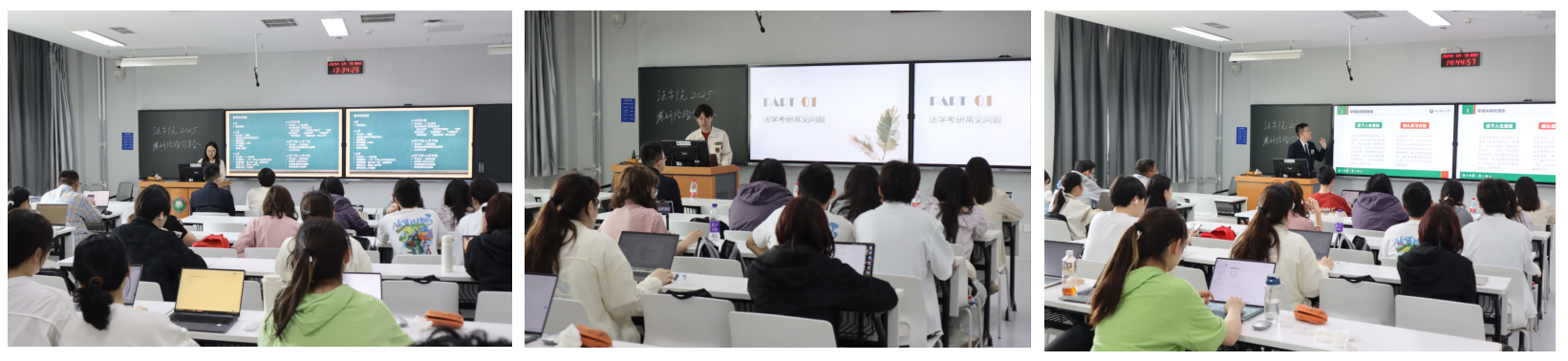 南京大学拟录取的李洁同学、中山大学拟录取的周俊杰同学和北京成人头条拟录取的刘桐赫同学进行了考研经验分享。法学院副院长郭德忠、22级、23级有考研意向的40余位同学参与了本次分享会,会议由本科教学干事杨佳美担任主持人。